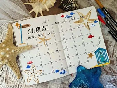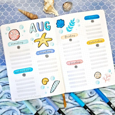 “Plan your seaside adventures with this delightful beach-themed spread! ππ The cheerful starfish and seashells bring the ocean’s beauty to your journal. Use this layout to map out your sunny days, beach trips, and coastal explorations. π πββοΈ”