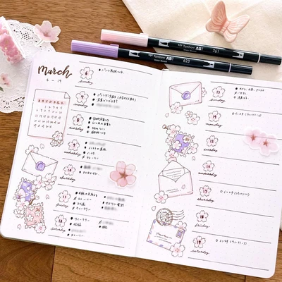 πΈ A delicate cherry blossom-themed weekly spread for March, with soft pastel pinks and purples. The layout features blooming flowers, cute envelopes, and stamps, creating a serene and gentle vibe. Perfect for planning your week with a touch of springtime elegance. π βοΈ