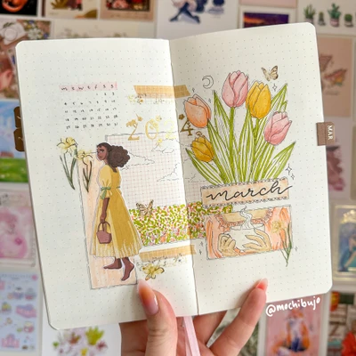 π·π§ “Welcome March with this enchanting tulip cover page. The tulip illustration is accompanied by a charming drawing of a girl enjoying the spring breeze, making the spread feel whimsical and lively. The pastel colors give it a soft, dreamy atmosphere, making it perfect for setting a gentle tone for the month of March. πΈ”