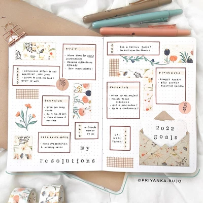πΈπ “Incorporate some vintage charm into your bullet journal with this floral reflection page. The soft pastel colors and delicate floral designs evoke a sense of nostalgia and serenity. This spread is ideal for reflecting on your goals, intentions, and thoughts, surrounded by the beauty of nature. Let your reflections bloom in this calming layout! πΌπ”