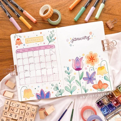 πΊπ “Kick off your year with this bright and cheerful January calendar! The vibrant floral border and bold colors make this spread a joyful start to your bullet journaling journey. Whether youβre planning your month or just enjoying the view, these flowers add a burst of energy and creativity to your pages. Let your year start in full bloom! πΌβ¨”