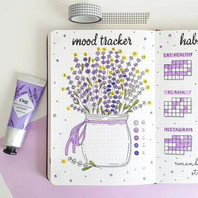 ππ± “Track your mood in style with this lovely lavender-themed spread. The soft purple and delicate sprigs of lavender arranged in a mason jar bring a calming, sweet atmosphere to your bullet journal. The mood tracker and habit tracker are both neatly incorporated, making it functional and beautiful. Perfect for adding a touch of tranquility to your daily life! π”