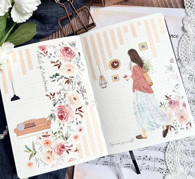 πΉ “In this enchanting layout, a serene figure walks amidst a garden of blooming roses. The soft pink and peach hues of the flowers blend beautifully with the delicate stripes in the background, creating a warm and inviting scene. This page is a gentle reminder to take time to slow down and savor the simple pleasures in life, just like a peaceful stroll through a rose garden. Let your journal be a place where your thoughts bloom as gracefully as these roses. πΏπΊ” πΉ