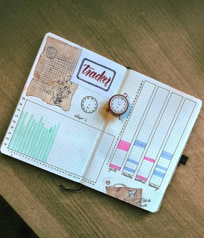 π°οΈπ “Enhance your habit tracking with this vintage-inspired bullet journal spread! πΏπ The left page showcases a sleep tracker with a graph for daily sleep hours, while the right page features a habit tracker with color-coded bars for cycling, cleaning, workout, and reading. π¨π The rustic design elements and charming illustrations add a unique touch, making tracking your habits both functional and aesthetically pleasing. Let this creative layout help you stay on top of your routines and achieve your goals!” ππ