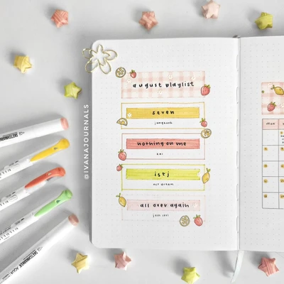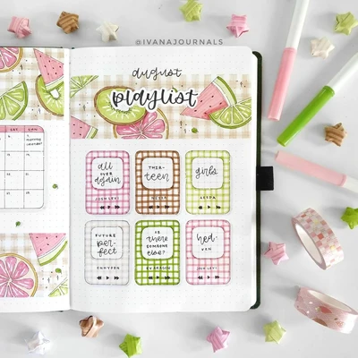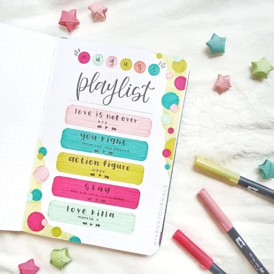 πΆ “Playlist love! ππ¦ This spread is dedicated to your favorite songs and playlists, adding a musical touch to your bullet journal. Keep track of your tunes with vibrant and fun design. ππ΅”