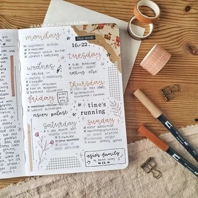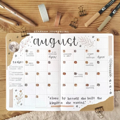 Dive into the sixth part of our August bullet journal inspiration series! π This collection showcases a variety of beautiful monthly and weekly spreads, cover pages, and habit trackers, all designed by the talented @saraah.journaling on Instagram. Her unique and artistic layouts will inspire you to keep your bullet journal both functional and visually appealing throughout August. Explore these ideas and elevate your bullet journal to new heights!