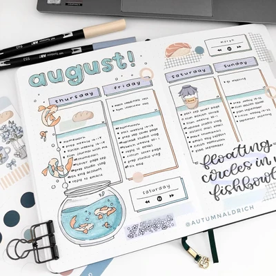 π “A playful underwater theme with cute fish illustrations makes this spread fun and lively. The colorful design and motivational quotes add a cheerful vibe to your August plans.” ππ