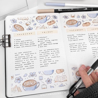 βπ Dive into a cozy cafΓ©-themed layout with delightful illustrations of coffee cups, pastries, and books. This spread adds a touch of warmth and charm to your bullet journal, making planning your days a comforting and enjoyable experience. βπ