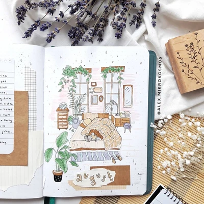 ππΏ “Dive into a creative journey with this scrapbook-style August cover! The blend of textures and layers creates a unique and personalized spread that tells your story. Use this inspiration to craft your monthly cover with snippets of your favorite things, and watch your journal come alive with character and charm. Embrace your creativity and let your personality shine through! βοΈβ¨”