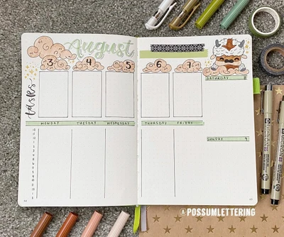 βοΈ “August is here, bringing a fresh start with fluffy clouds and adorable doodles! π€οΈ This weekly spread is perfect for keeping track of tasks and appointments. The serene colors and playful designs add a touch of joy to every day. Letβs embrace the new month with organization and creativity! π ⨔