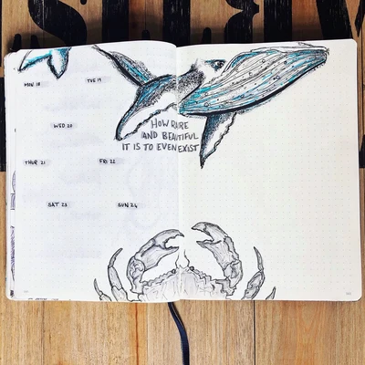 πβ¨ “How rare and beautiful it is to even exist. ππ¦ This stunning bullet journal spread featuring a majestic whale and a detailed crab captures the wonder of the ocean and the beauty of existence. ππ¨ Let this artwork remind you to appreciate the unique moments in life and embrace your creativity. ππ Dive deep into your journaling and let your pages reflect the beauty around you. ππ” πππ¦