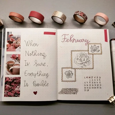“Celebrate the month of love with this charming February spread. ππ The romantic elements and heartfelt quotes make it a perfect page for capturing your special moments and thoughts. Let this spread inspire you to fill your days with love and positivity. πΉβ¨”