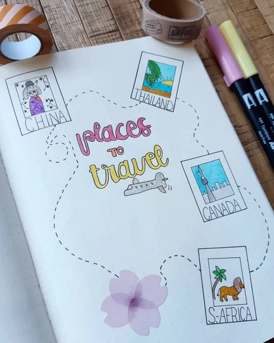 πβ¨ “Dreaming of new adventures? βοΈ This travel-themed bullet journal spread is a wonderful way to plan and visualize your dream destinations! πΊοΈπΈ The playful illustrations and vibrant colors make each place come alive, sparking excitement for future travels. ππ Start your own travel journal and let your wanderlust guide your creativity! ππ Happy travels! ππ” ποΈπΏ