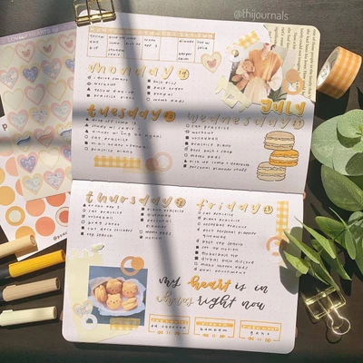 ππͺ “Fill your days with sunshine and sweetness! π This charming spread captures the warmth of July with its golden hues and delightful details. π From organized to-do lists to cute macaron doodles, it’s a perfect blend of productivity and joy. π Let this inspire you to infuse your bullet journal with the things that make your heart happy. π Every page is a canvas for your dreams and daily adventures. Embrace the warmth and create a week full of love and light! πΌβ¨” ππ