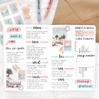 π΄β¨ “Embrace the summer vibes and stay organized with this delightful bullet journal spread! βοΈ The soft pastel colors and beach-themed accents create a serene and motivating environment to plan your week. π From habit and sleep trackers to thoughtful goal-setting, this layout encourages you to balance productivity and self-care. ποΈ Let the peaceful beach scenes remind you to relax and enjoy the journey, making your daily tasks a joyful experience. π Dive into your bullet journal and make each week a beautiful adventure!” ππΊ