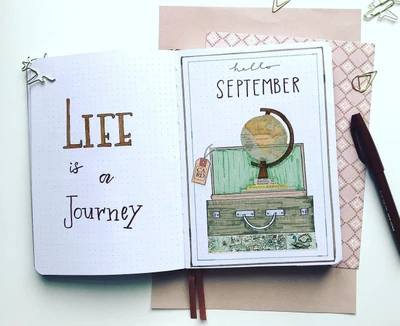 ๐ “Embark on the adventure of a lifetime! โ๏ธ The travel-inspired theme and vintage suitcase evoke a sense of exploration and discovery. ๐ Let your bullet journal be a map of your life’s journey. ๐โจ”