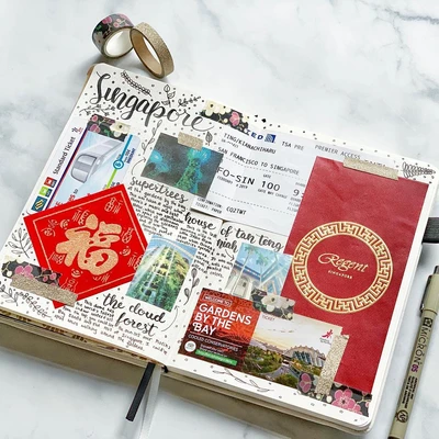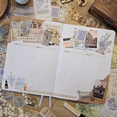 ๐๐จ “Capture your travel experiences in this creative and eclectic spread. Filled with ticket stubs, postcards, and travel notes, this layout is perfect for preserving your memories and adding a personal touch to your journal. Let your adventures unfold on these pages. โ๏ธ๐”