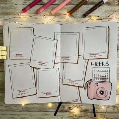 “Plan your week with this travel-themed layout. Featuring Polaroid-style frames for each day, it’s perfect for jotting down daily highlights and travel notes. Great for keeping track of your itinerary and capturing memories. ๐ท๐๏ธ”