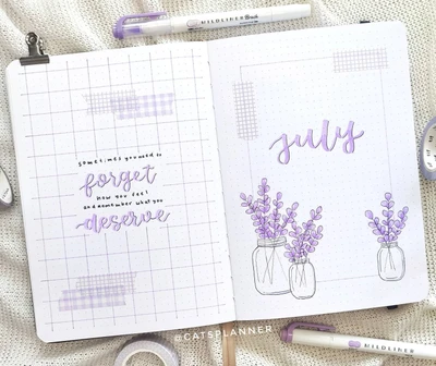 ππΏ “This July bullet journal spread exudes calm and positivity with its soft lavender tones and minimalist design. The hand-drawn jars filled with delicate flowers add a touch of elegance, while the motivational quote encourages us to focus on what we deserve. The simplicity of the layout combined with the gentle colors makes it a perfect way to start the month with a peaceful mind and a positive outlook.”
