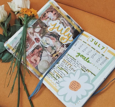 π»β¨ “Embrace the vibrant energy of summer with this cheerful July bullet journal spread! The collage of summer activities and warm yellow accents bring a sense of fun and adventure. The goals section is a great way to stay motivated and organized, while the flower doodles add a playful touch. This spread is perfect for capturing the essence of sunny days and making the most of the month.”