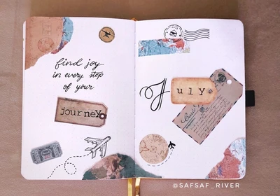 π«π “This travel-inspired July bullet journal spread is perfect for wanderlust souls! The vintage maps, airplane doodles, and travel tags evoke a sense of adventure and exploration. The quote ‘find joy in every step of your journey’ is a lovely reminder to cherish each moment. A beautifully crafted spread to inspire your travels and capture your summer memories.”