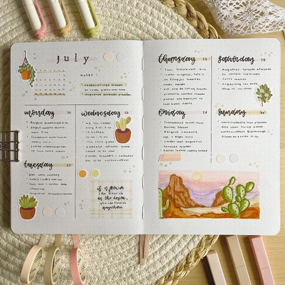 π΅β¨ “Let your bullet journal be a reflection of your unique style and creativity. ππ Embrace the serene desert vibes and earthy tones, bringing a sense of calm and focus to your weekly planning. πΏπ Each page is a canvas for your goals, tasks, and inspirations, beautifully organized and adorned with charming illustrations. π¨πΌ”