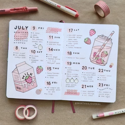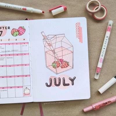 “This adorable July bullet journal spread is a strawberry lover’s dream! π Featuring vibrant illustrations of strawberries and milk cartons, it captures the essence of summer’s sweetest fruit. π₯€π The playful designs and soft pink hues bring a cheerful and refreshing vibe to your planning. πΈπ Perfect for adding a touch of fruity fun to your month!”