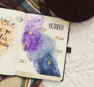 🌟 “Step into October with a splash of cosmic watercolor! 🌟 This spread features a beautiful blend of blues and purples, creating an ethereal night sky effect. 🌌✨ The artist’s dreamy design invites you to explore the mysteries of the moon and stars as you plan your month. 🌙” 🌠📅