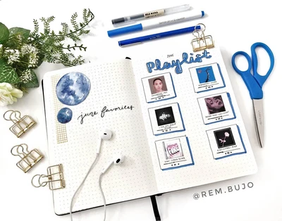 “Combine your love for music and the moon with this lunar-themed playlist spread. 🎶🌕 The soft blue tones and celestial accents create a relaxing atmosphere, ideal for listing your favorite tunes. Let the moonlight inspire your listening. 🎧🌙”