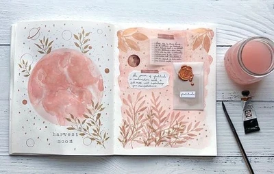 🌕 “Embrace the ethereal beauty of the Harvest Moon with this stunning journal spread! 🌕 The soft pink hues and delicate gold accents create a dreamy and serene atmosphere. 🍂✨ The artist has beautifully illustrated the moon surrounded by foliage, capturing the essence of autumn. 📝 This layout is perfect for reflecting on the changing seasons and setting intentions for the months ahead.” 🌿