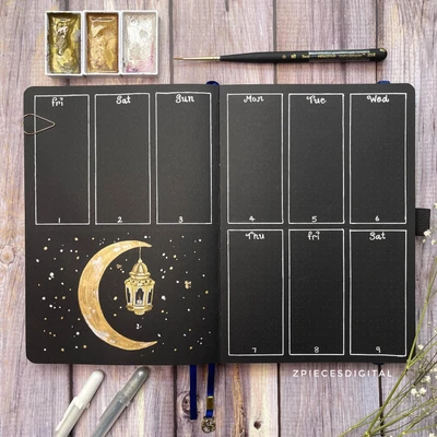 🌠 “Dive into the night with a dark-themed weekly planner! 🌠 This spread uses a black background to accentuate the golden moon and stars, creating a striking contrast. 🌚✨ The artist’s minimalist yet impactful design makes each week feel like a journey through the cosmos. 🌌” 🌙📆