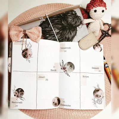 🌕 “Center your week around the full moon! 🌕 This spread features a circular layout with a central moon illustration, symbolizing balance and completeness. 🌝✨ The artist’s creative approach and harmonious design make this page a captivating focal point in your journal. 🌜” 🌠🗓️