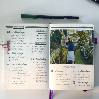 “Take a journey through your tasks with a touch of green. πΏ This beautifully curated spread combines photos, stickers, and green accents, making every page feel like a getaway. πΈβ¨ Perfect for those who want to stay organized while daydreaming of nature’s serenity. πΌ”