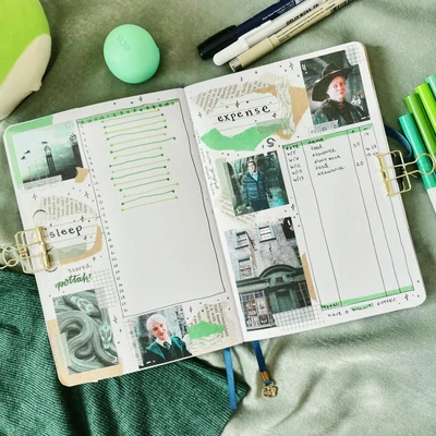 βThis creative bullet journal spread combines a sleep tracker and an expense log with a touch of magic! Featuring a Harry Potter theme, it helps you monitor your sleep patterns and manage your budget efficiently. The neat, dotted grid makes it easy to see your progress at a glance, and the fun, themed decor adds a bit of excitement to your daily routine. Stay organized and enchanted all month long! πβ¨β